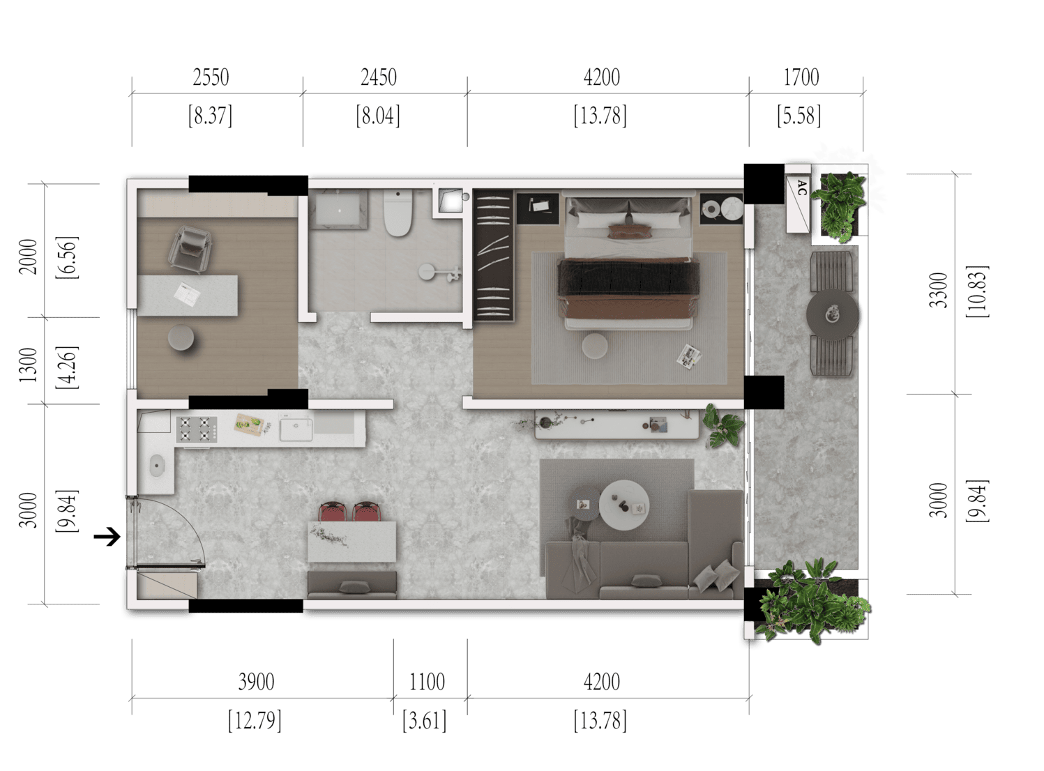 - Total Area: 735.82 Sqft